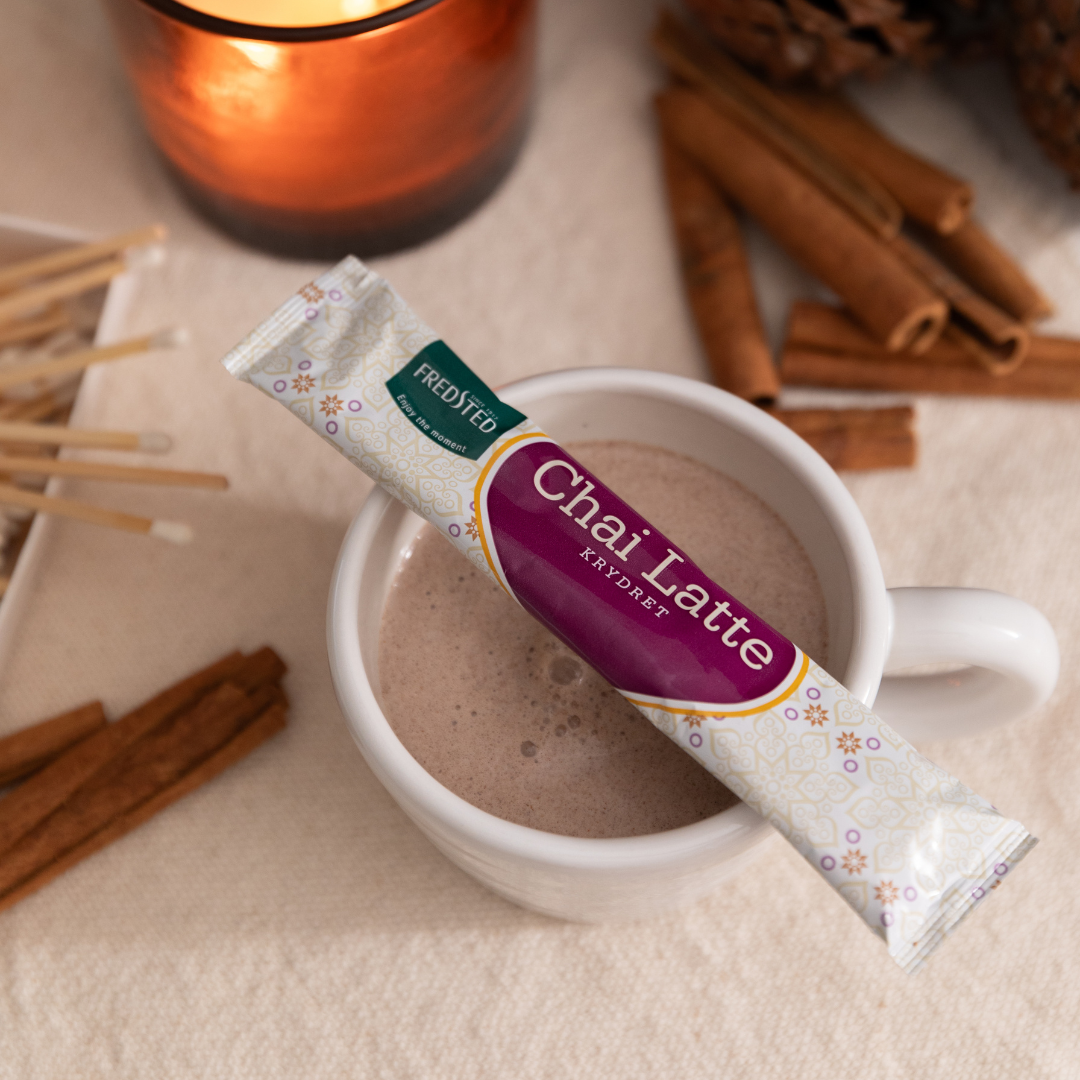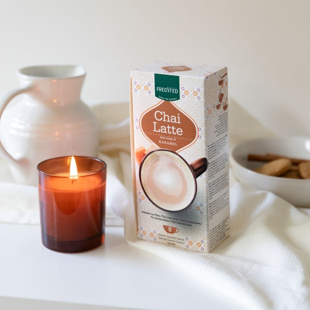 Fredsted Chai Latte Karamell kombinerer klassiske chai-krydder som kanel, kardemomme og ingefær med den myke smaken av karamell. Resultatet er en rund og kremet drikk som varmer på kalde dager, nyt den inne i sofakroken eller ute i høstluften.