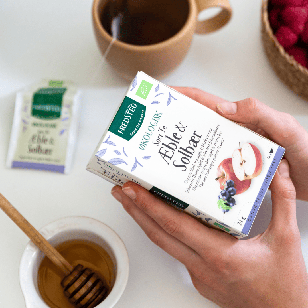 Fredsted Eple & Solbær er en økologisk te som kombinerer den naturlige sødmen fra epler med den dype, syrlige smaken av solbær. Resultatet er en rund og forfriskende fruktte som kan nytes både varm og kald – perfekt hele året.