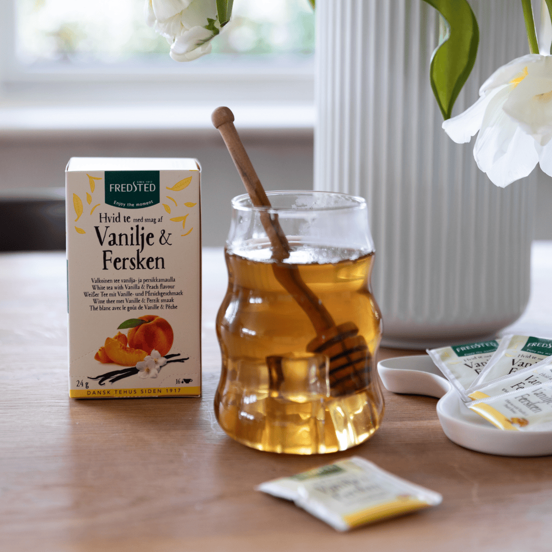 Fredsted Vanilje & Fersken er perfekt når du ønsker en myk og rund teopplevelse, perfekt når du trenger en liten pause i hverdagen eller som en varm dessertdrikk.